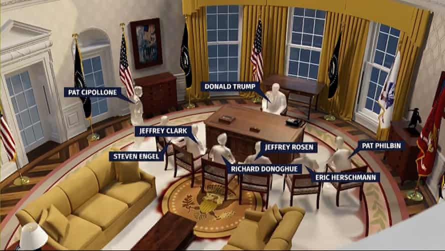 Like an episode of The Apprentice, the meeting deteriorated into recriminations that left Clark looking like a loser, and thus fated to be cut loose by Trump. The other attorneys pointed out that he had no experience of any kind in criminal prosecutions and didn’t even know where the FBI Director’s office was located. Clark replied that he would withdraw his plan to be AG if Rosen and Donoghue signed the letter to the Georgia officials. At one point, Donoghue cracked, “How about you go back to your office and we’ll call you when there’s an oil spill.”