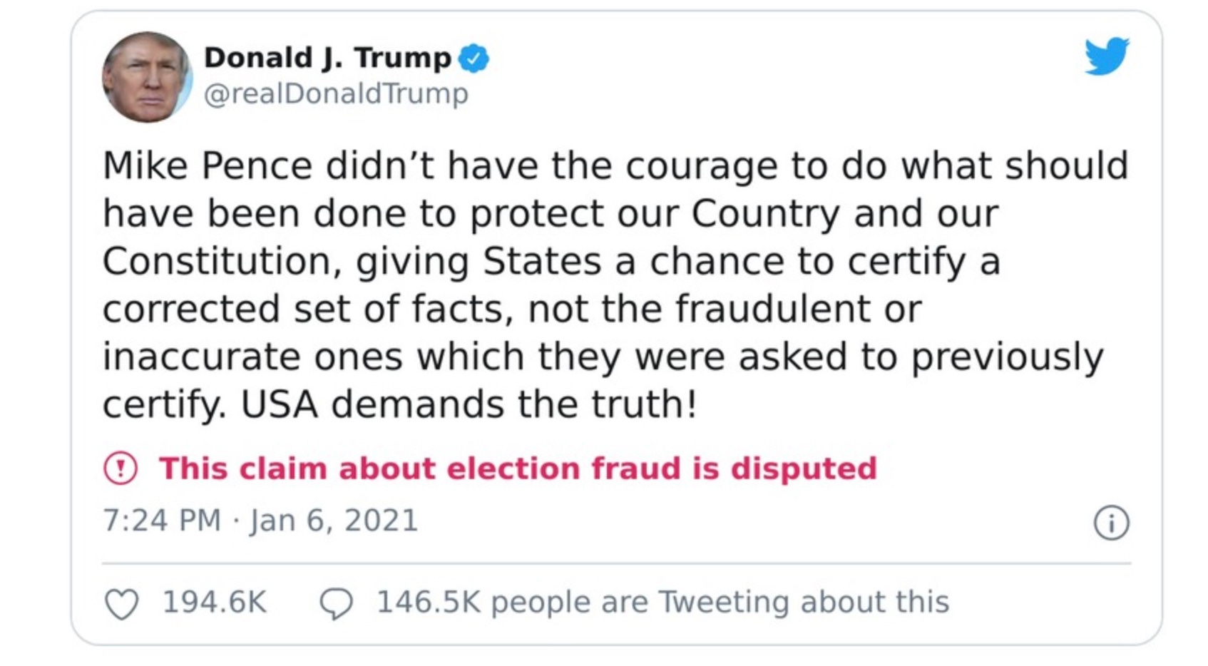 While Eastman will be soon forgotten, Trump will never escape what may eventually be known as The Smoking Gun Tweet, which establishes that he continued his efforts to overthrow the constitutional order even after a violent rebellion had begun. At 2:24 p.m. on January 6th, the president tweeted: